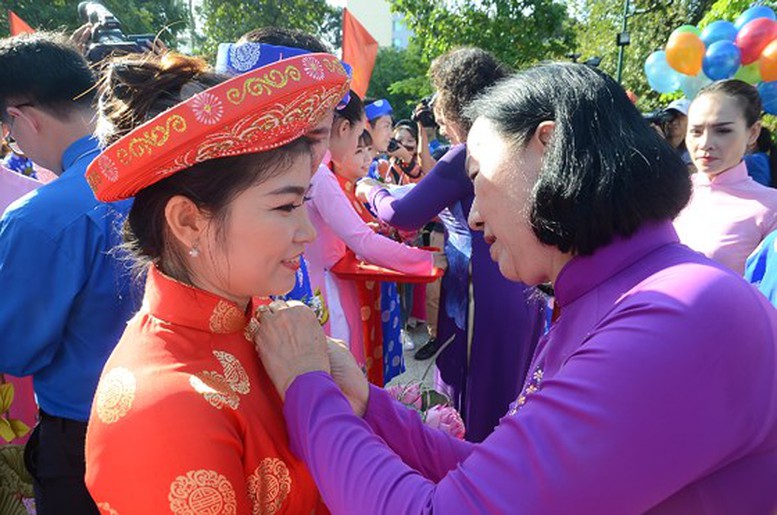 | Phó Chủ tịch HĐND TPHCM Trương Thị Ánh chúc mừng hạnh phúc những đôi vợ chồng trẻ trong ngày cưới. |