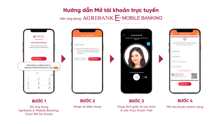 Khách hàng đăng ký và mở mới tài khoản Agribank chỉ cần tải ứng dụng Agribank E-Mobile Banking, nhập số điện thoại, chụp ảnh giấy tờ tùy thân và xác thực khuôn mặt theo yêu cầu, hoàn tất mở tài khoản.