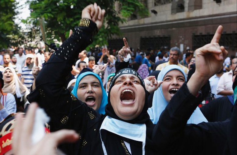 | Người biểu tình hô vang khẩu hiệu gần nhà thờ Hồi giáo Ennour ở Cairo hôm nay. Ảnh: Reuters |