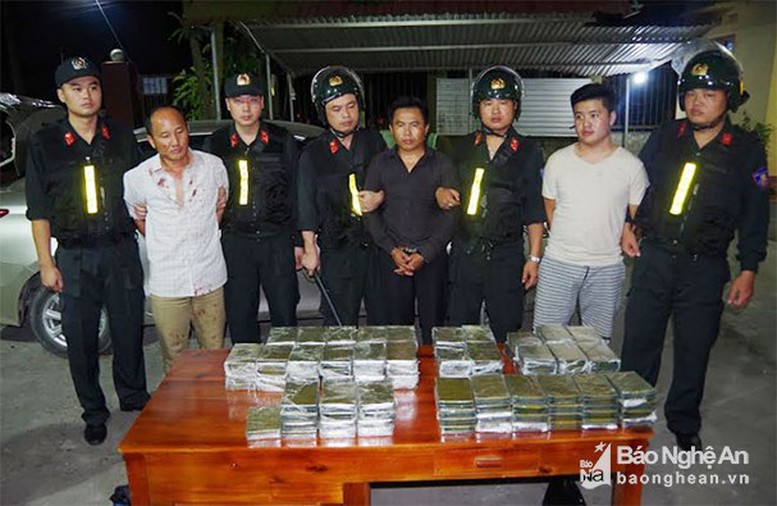 Các đối tượng cùng tang vật vụ án. Ảnh: Báo Nghệ An |