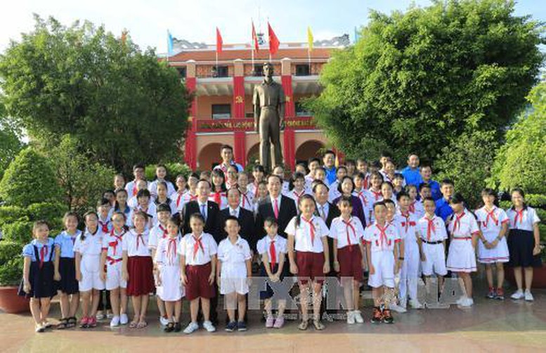 Chủ tịch nước Trần Đại Quang và lãnh đạo TPHCM cùng các cháu thiếu nhi là đại biểu Đại hội Cháu ngoan Bác Hồ TPHCM. Ảnh: TTXVN