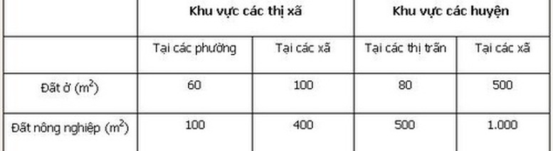 Cụ thể, diện tích tối thiểu đối với đất ở, đất nông nghiệp được phép tách thửa đối với khu vực các huyện, thị xã được quy định như sau: