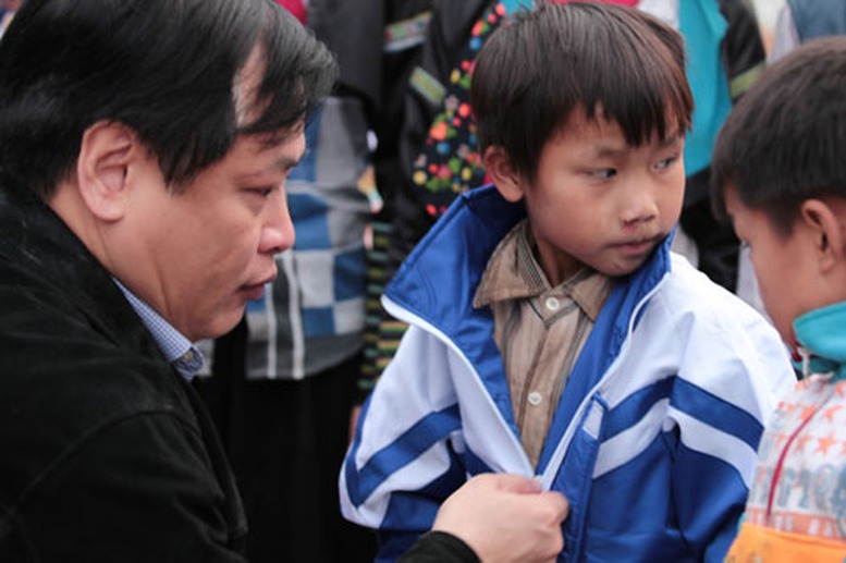 | Tổng Biên tập Báo Điện tử Chính phủ Vi Quang Đạo khoác áo ấm cho một em học sinh người Mông xã Pá Hu - Ảnh: VGP/Xuân Hồng |
