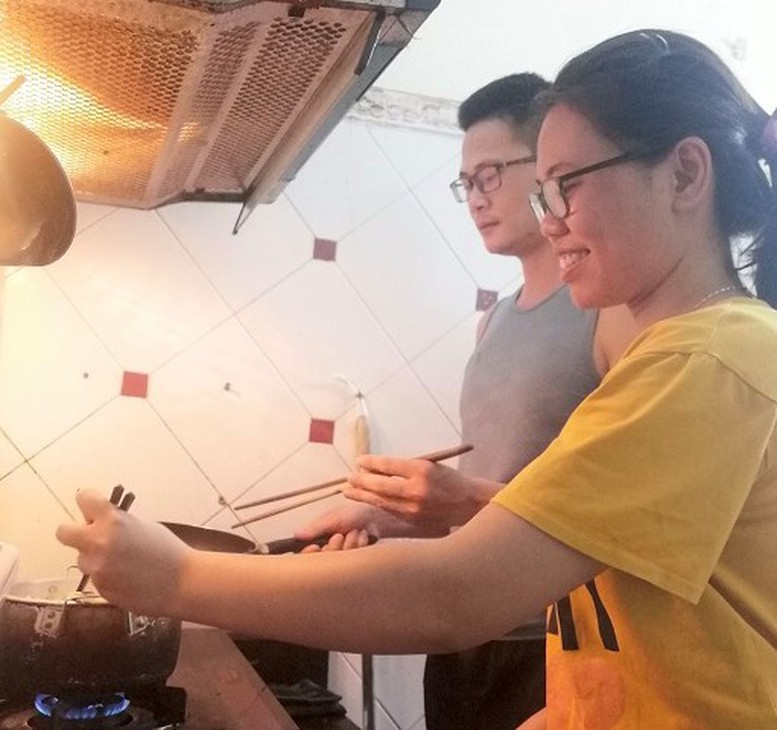 | Hai vợ chồng chị Vũ Hồng Vân cùng nấu ăn trong mùa dịch. Ảnh: VGP/Hoàng Giang |