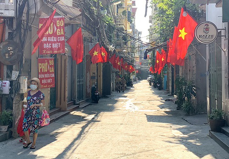 Từng con ngõ nhỏ cũng rực rỡ cờ Tổ quốc với niềm tự hào của mỗi người dân khi nhớ về mùa Thu lịch sử cách đây 75 năm - Ảnh: Đoàn Bắc