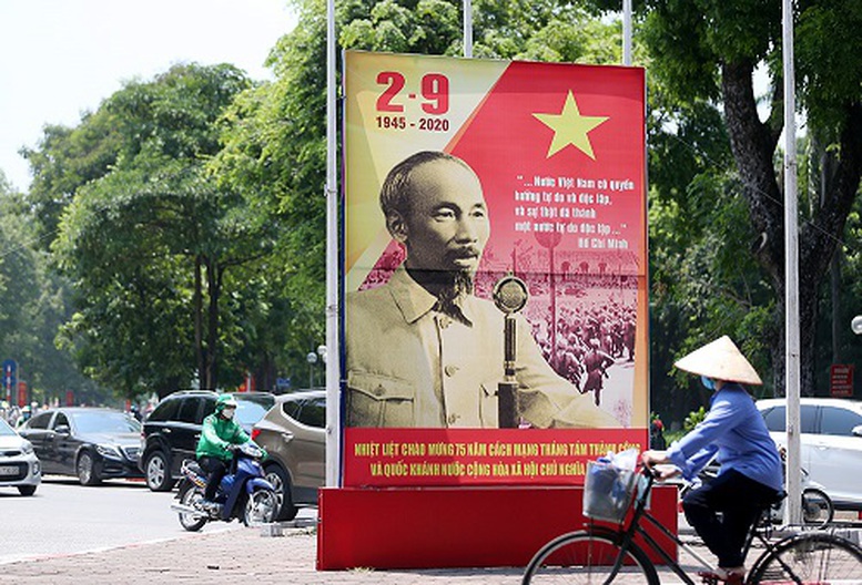 Khẩu hiệu mang dòng chữ “Nhiệt liệt chào mừng kỷ niệm 75 năm Quốc khánh nước Cộng hòa xã hội chủ nghĩa Việt Nam” được trang trí khắp các tuyến phố - Ảnh: VGP/Đoàn Bắc