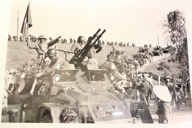 Tác phẩm Đoàn xe quân sự của quân đội Bắc Việt Nam được nhân dân nhiệt liệt chào mừng khi xuôi vào Nam. Ảnh: Đoàn Công Tính