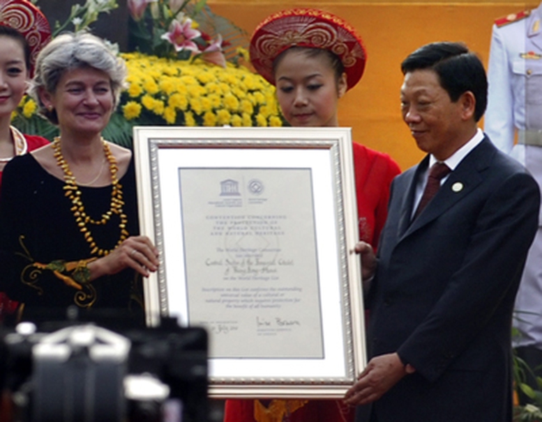 Tổng Giám đốc UNESCO Irina Bokova trao bằng Di sản văn hoá thế giới khu Trung tâm Hoàng thành Thăng Long cho Chủ tịch UBND TP Hà Nội Nguyễn Thế Thảo - Ảnh Chinhphu.vn |