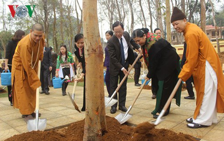 | Phó Chủ tịch Thường trực Quốc hội Tòng Thị Phóng cùng các đại biểu trồng cây lưu niệm tại Nhà tưởng niệm. Ảnh: VOV |