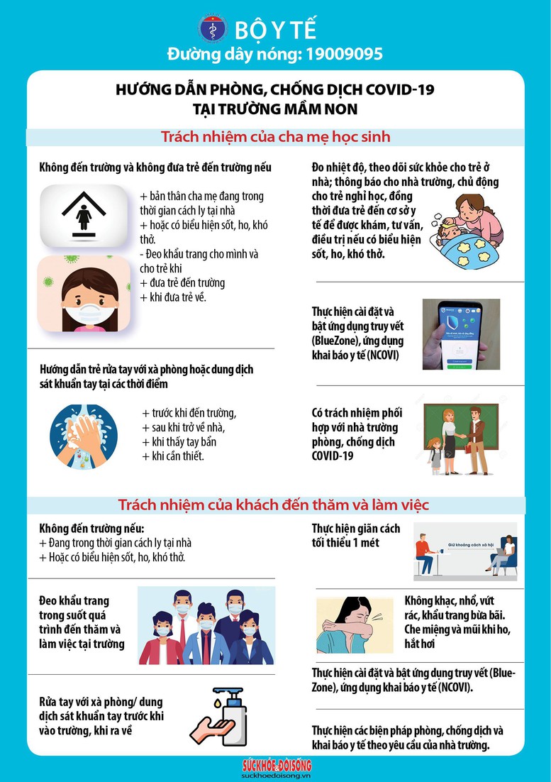 Cụ thể như trách nhiệm của Ban giám hiệu được yêu cầu như: Tổ chức đo thân nhiệt trước khi vào trường đối với học sinh, giáo viên, người lao động tại trường, cha mẹ học sinh vào trường, khách đến thăm và làm việc; thực hiện khai báo y tế đối với các trường hợp có biểu hiện sốt, ho, khó thở. Bố trí người đón và giao trẻ tại cổng trường; hạn chế người ra vào trường; hạn chế tiếp xúc giữa học sinh các lớp với nhau. Phân công thực hiện vệ sinh, khử khuẩn bằng hóa chất khử khuẩn hoặc chất tẩy rửa thông thường...