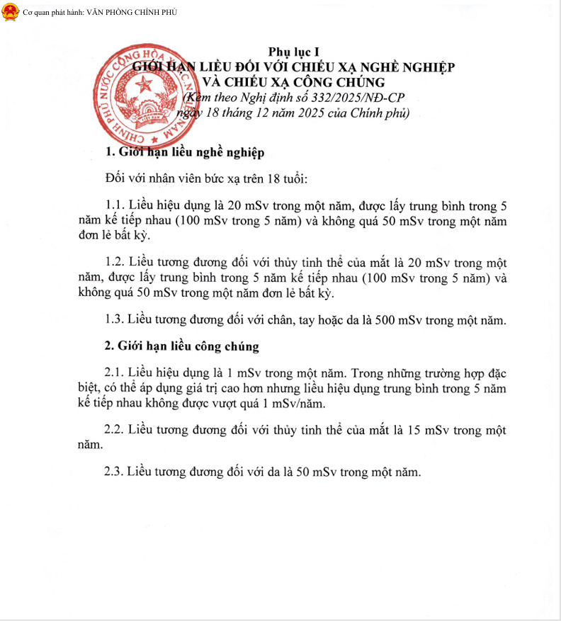 Chính phủ ban hành Nghị định số 332/2025/NĐ-CP quy định chi tiết và biện pháp thi hành một số điều của Luật Năng lượng nguyên tử về bảo đảm an toàn bức xạ, an toàn, an ninh, thanh sát hạt nhân, thông báo, khai báo, cấp phép, thanh tra, kiểm tra về an toàn bức xạ và hạt nhân, ứng phó sự cố bức xạ, sự cố hạt nhân và bồi thường thiệt hại hạt nhân.