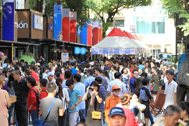 | Đông đảo người dân TPHCM dạo đường sách sau lễ khai trương. Ảnh: TBKTSG |