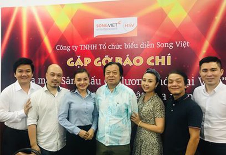 | Soạn giả Hoàng Song Việt (thứ hai bên phải), NSƯT Triệu Trung Kiên (thứ hai bên trái) và các nghệ sĩ cải lương tại buổi họp báo ra mắt “Sân khấu cải lương mới Đại Việt” |