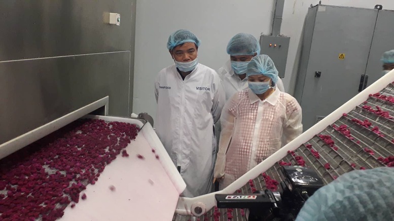 Bộ trưởng Bộ NN&PTNT Nguyễn Xuân Cường thăm nhà máy chế biến thanh long của Lavifood tại Long An. Ảnh: VGP/Lê Anh |