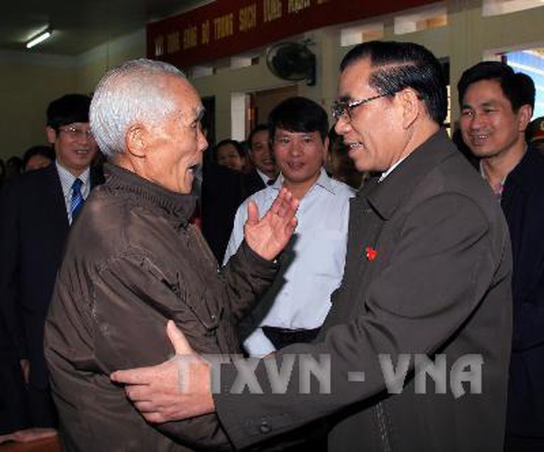 Nhân dịp này, Tổng Bí thư Nông Đức Mạnh tới thăm và tặng quà ông Trần Vũ, 80 năm tuổi Đảng hiện đang sinh sống ở thị trấn Chùa Hang.