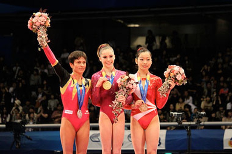 Phan Thị Hà Thanh (hàng đầu bên phải) trên bục nhận Huy chương Đồng. Ảnh: FIG |
