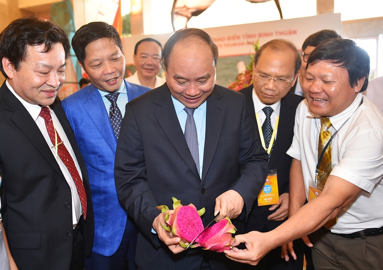 | Thủ tướng với trái thanh long đỏ - biểu tượng trái cây Bình Thuận. Ảnh: VGP/Quang Hiếu |