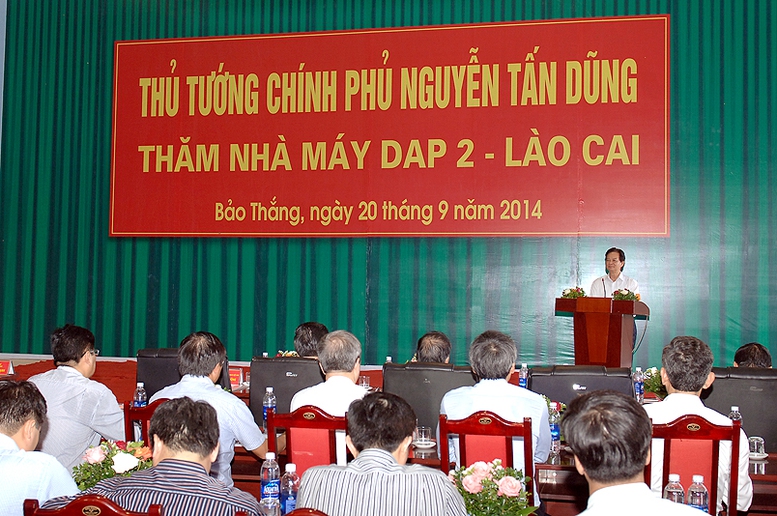 | Thủ tướng Nguyễn Tấn Dũng thăm và nói chuyện với cán bộ, nhân viên nhà máy DAP 2-Lào Cai. Ảnh: VGP/Nhật Bắc |