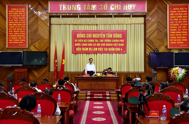 Với tinh thần này, Thủ tướng Nguyễn Tấn Dũng mong muốn các cán bộ, chiến sĩ lực lượng vũ trang Quân khu 4 luôn phát huy tinh thần đoàn kết, thống nhất, trên dưới một lòng; phục tùng tuyệt đối sự lãnh đạo của Đảng, mệnh lệnh của cấp trên; tuyệt đối trung thành với Tổ quốc, hết lòng hết sức phục vụ đất nước và nhân dân; luôn nêu cao tinh thần cảnh giác, sẵn sàng chiến đấu và chiến thắng, không để bị động, bất ngờ trước mọi tình huống; bảo vệ vững chắc an ninh-quốc phòng trên địa bàn được phân công…