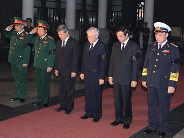 Chủ tịch Quốc hội Nguyễn Sinh Hùng, nguyên Tổng Bí thư Đỗ Mười; nguyên Chủ tịch nước Lê Đức Anh; nguyên Chủ tịch nước Trần Đức Lương... đã gửi vòng hoa viếng.