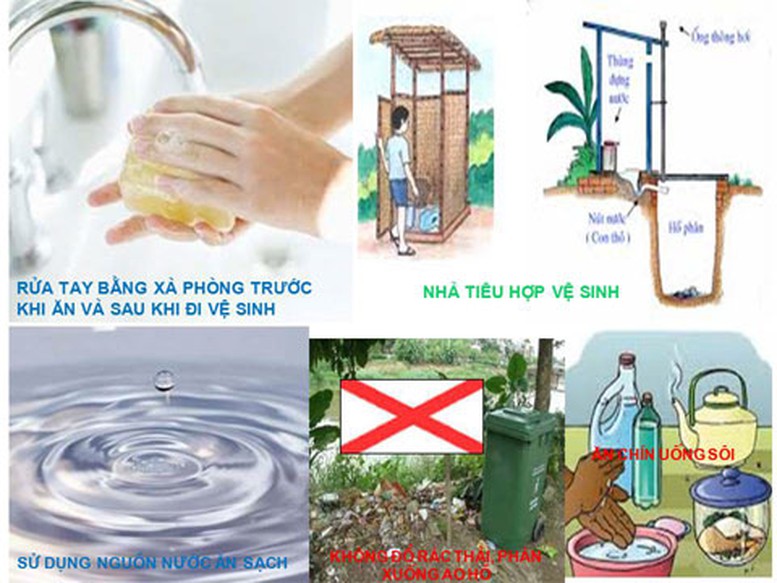 Vệ sinh cá nhân, vệ sinh môi trường: Rửa tay bằng xà phòng trước khi ăn và sau khi đi vệ sinh; mỗi gia đình có một nhà tiêu hợp vệ sinh, cấm đi tiêu bừa bãi; nguồn nước ăn uống phải được bảo vệ sạch sẽ; không đổ rác thải, phân xuống ao, hồ
