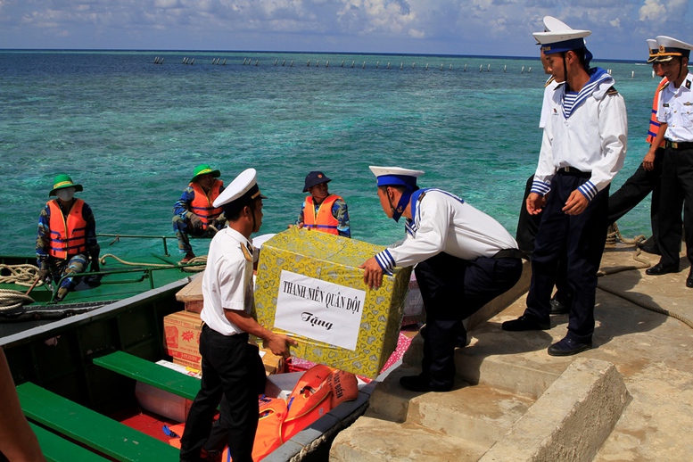 | Chiến sĩ đảo Đá Lớn nhận quà của đất liền. Ảnh: VGP/Thế Phong |