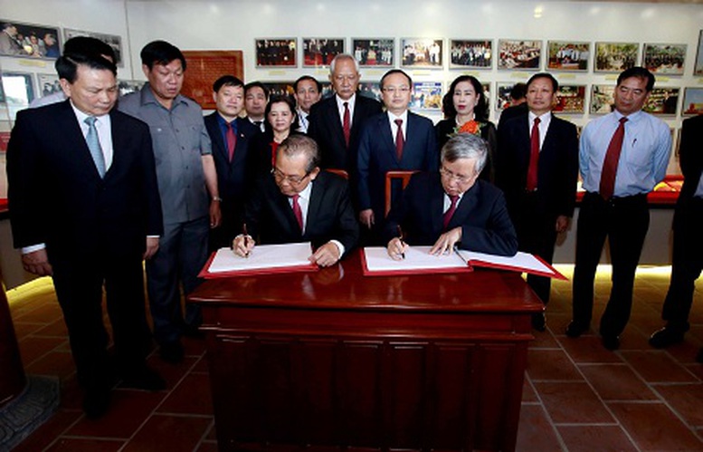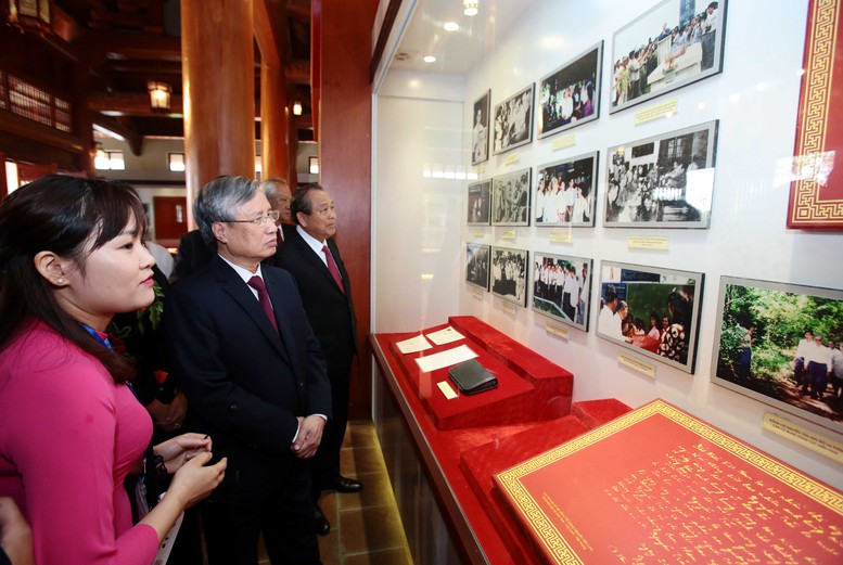 | Đồng chí Trần Quốc Vượng và đồng chí Trương Hòa Bình ghi lưu bút tại Khu lưu niệm. - Ảnh: VGP/Lê Sơn |