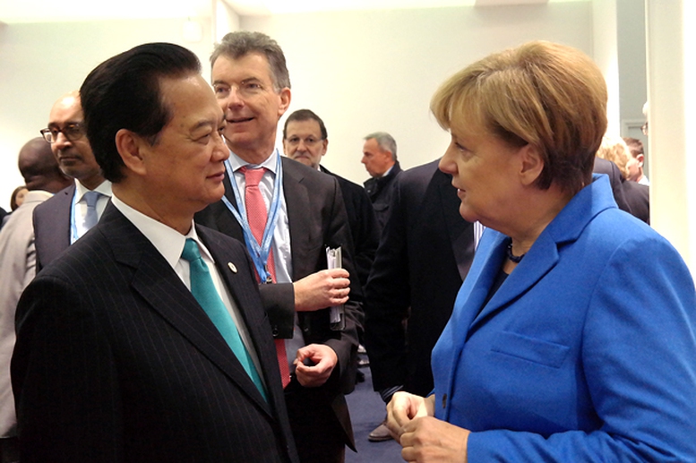 | Thủ tướng Nguyễn Tấn Dũng và Thủ tướng Đức Angela Merkel tại phiên khai mạc COP 21. Ảnh: VGP/Nhật Bắc |