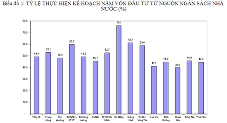 Một là, tỷ lệ thực hiện vốn đầu tư phát triển từ nguồn ngân sách nhà nước so với kế hoạch cả năm sau 7 tháng nhìn chung còn thấp. Tỷ lệ thực hiện 7 tháng so với kế hoạch của tổng số, theo cấp quản lý và theo một số Bộ, ngành, tỉnh/thành phố có kế hoạch vốn lớn như sau.