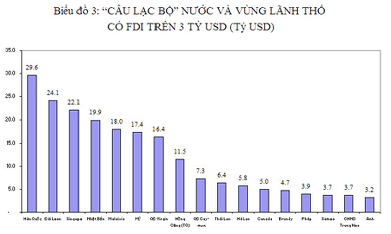 Tính từ 1988 đến nay, “Câu lạc bộ” các nước và vùng lãnh thổ có lượng vốn FDI đăng ký đạt từ 1 tỷ USD trở lên có 22 thành viên, trong đó có 21 thành viên đạt trên 2 tỷ USD và 17 thành viên sau đây đạt trên 3 tỷ USD.